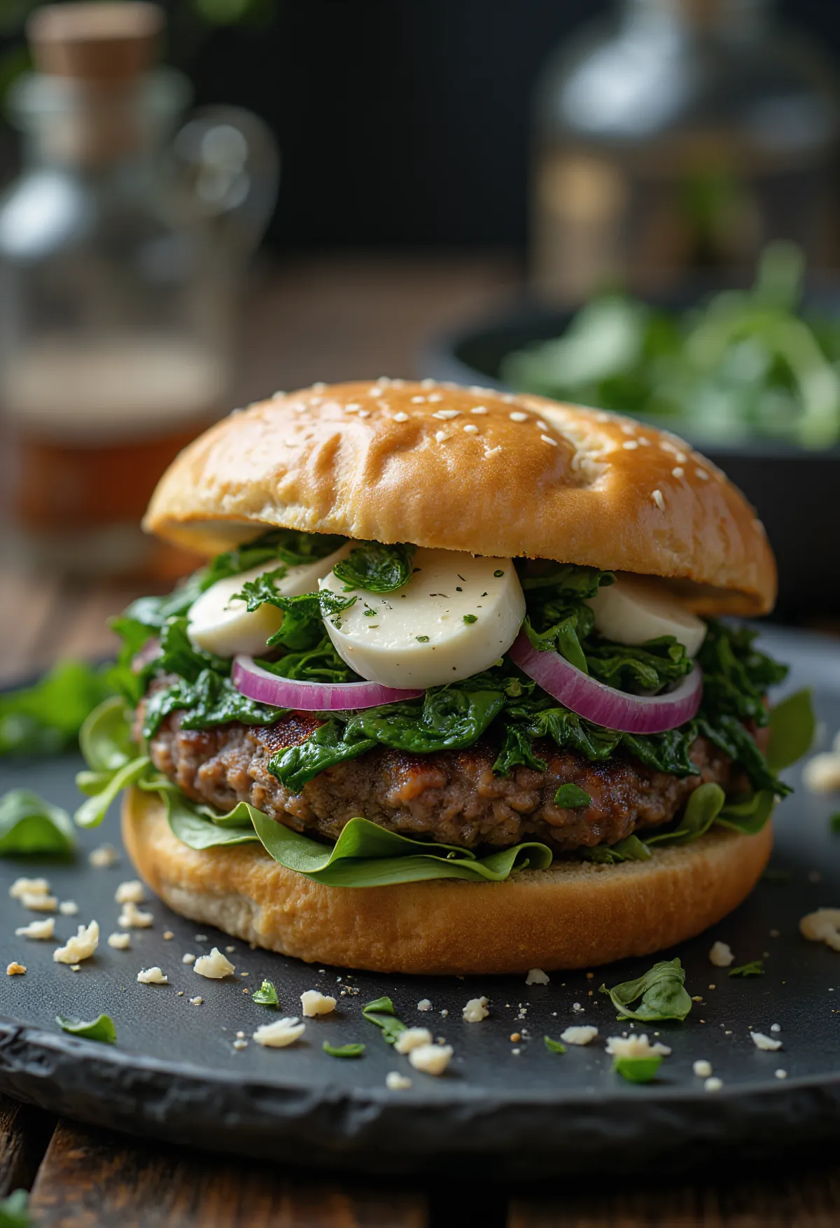 Burger s špinačo in kozjim sirom